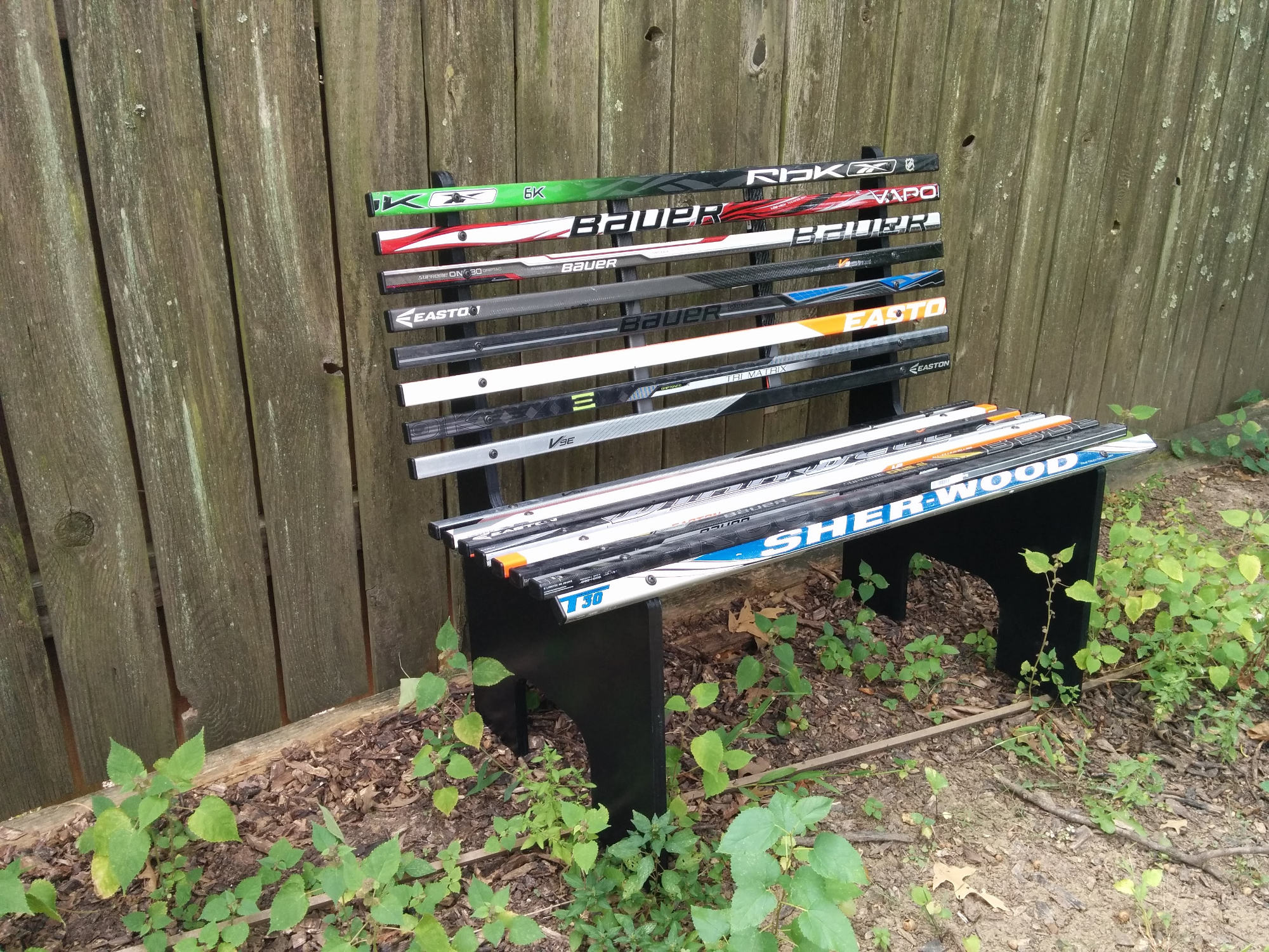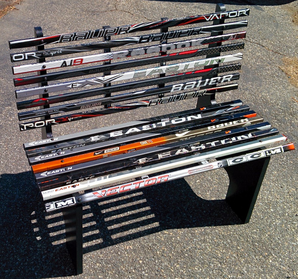 A hockey stick bench designed for outdoor use. Weather-resistant construction for patios and rinks.