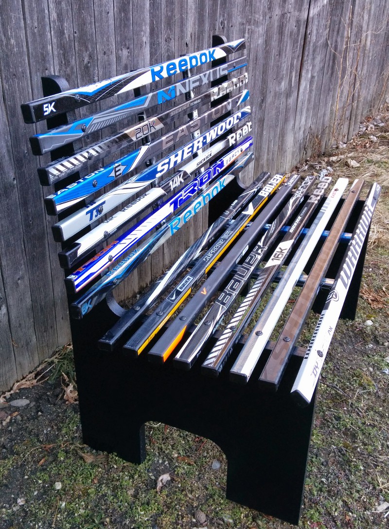 An upgraded hockey stick bench featuring a full backrest. Multiple design variations shown.