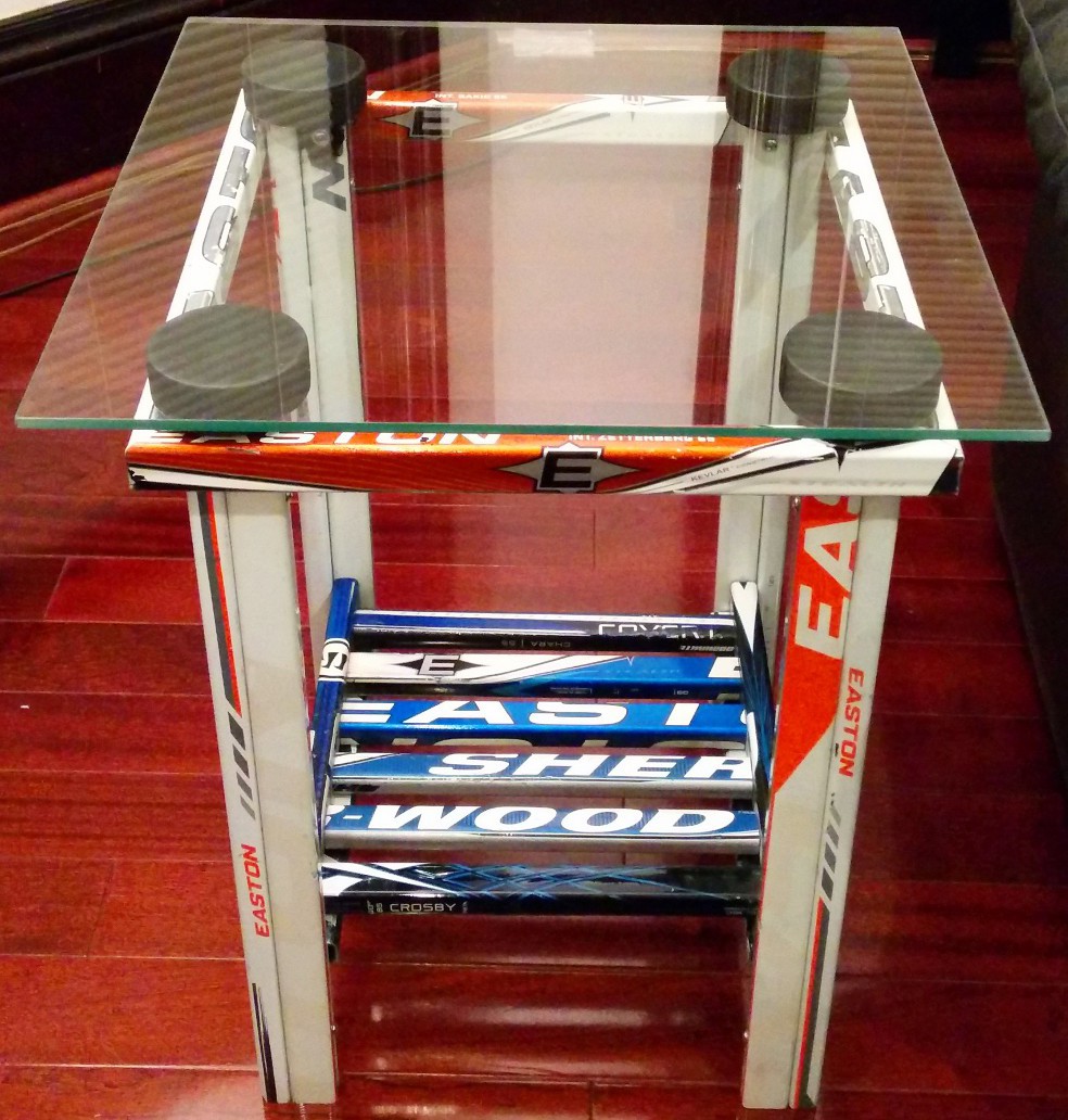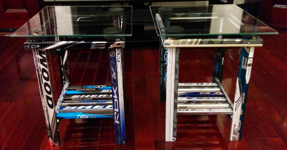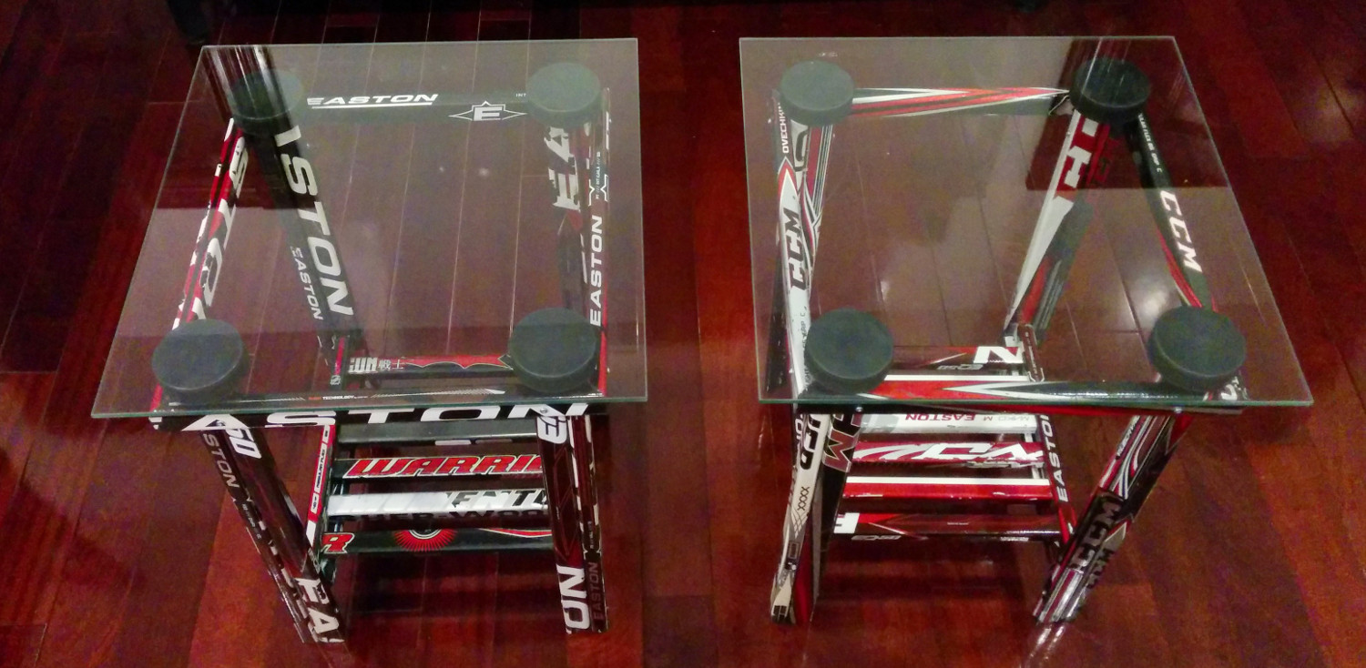 Compact end tables built from hockey sticks, available in multiple color schemes. Perfect as side tables or nightstand alternatives.
