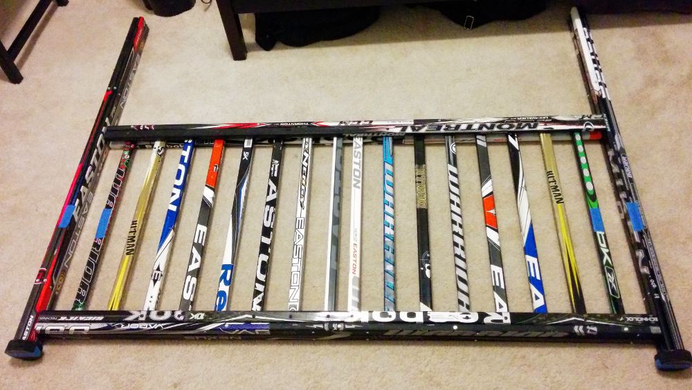 A bed headboard made entirely from hockey sticks. A bold statement piece for any hockey fan's bedroom.