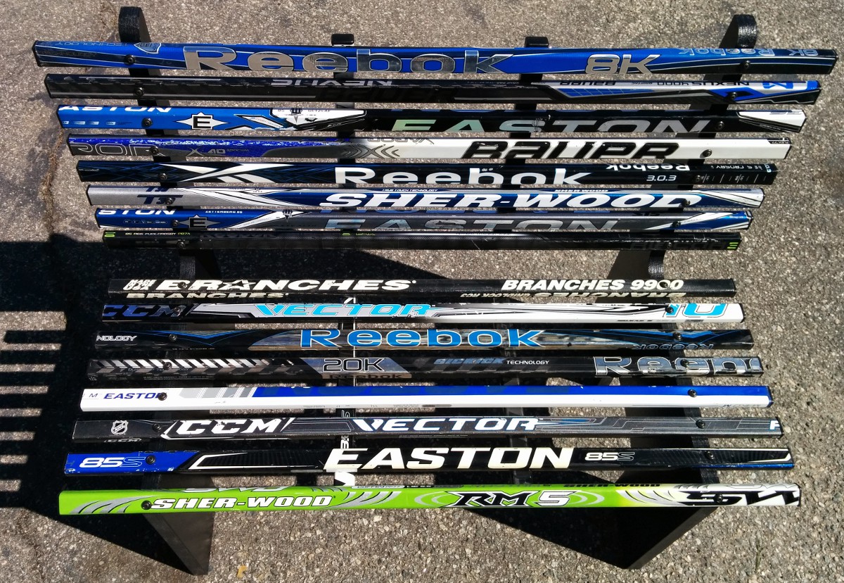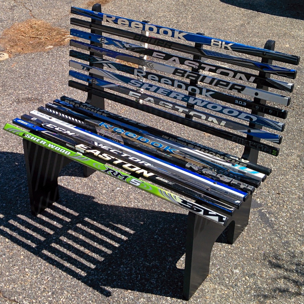 A hockey stick bench designed for outdoor use. Weather-resistant construction for patios and rinks.