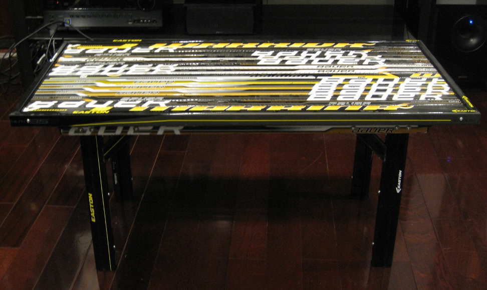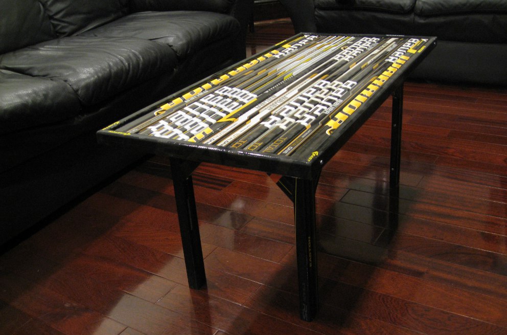 A coffee table built from composite hockey sticks with angled legs. A modern, sleek variation on the classic hockey table.