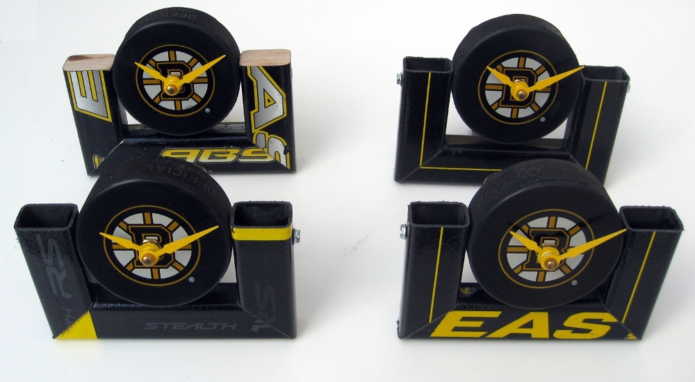 A wall-mounted clock made from hockey pucks with stick frame. Features a three-puck design with routed center for the clock movement.