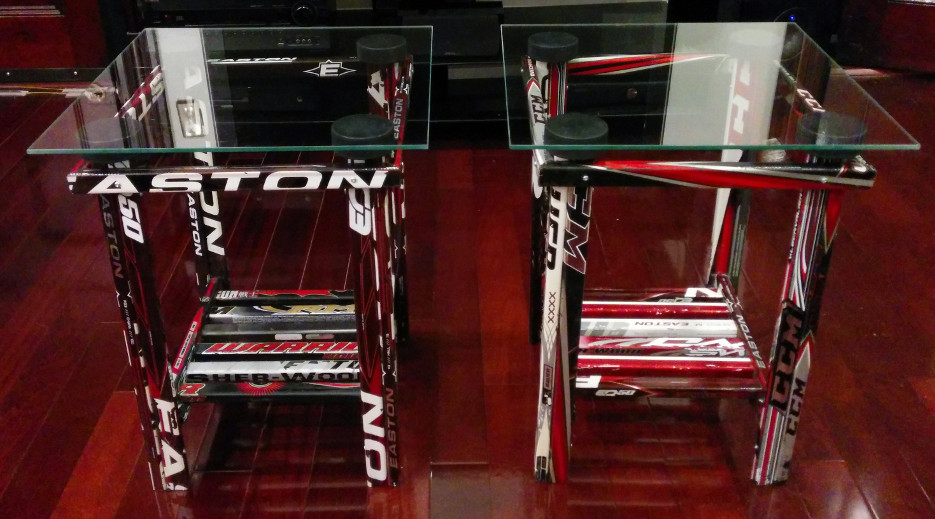 Compact end tables built from hockey sticks, available in multiple color schemes. Perfect as side tables or nightstand alternatives.