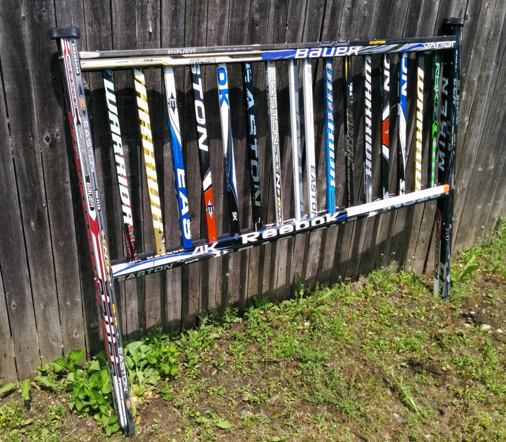 A hockey stick bench designed for outdoor use. Weather-resistant construction for patios and rinks.
