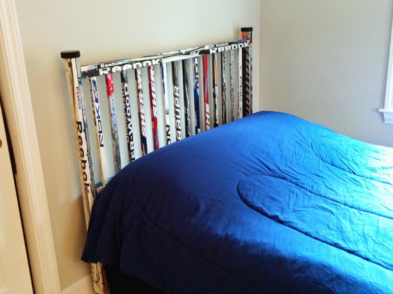 A bed headboard made entirely from hockey sticks. A bold statement piece for any hockey fan's bedroom.