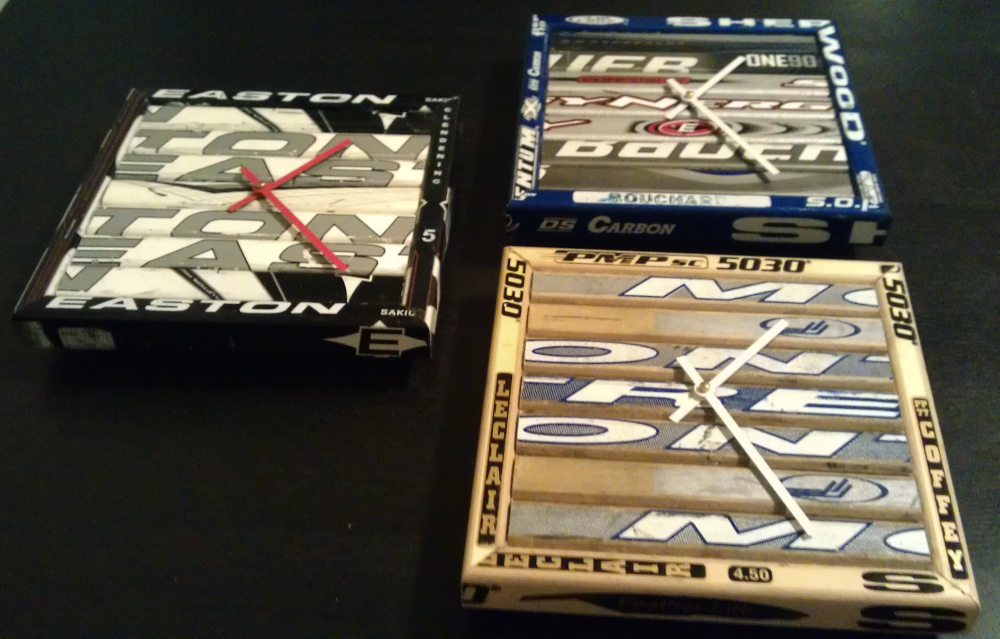 A wall-mounted clock made from hockey pucks with stick frame. Features a three-puck design with routed center for the clock movement.